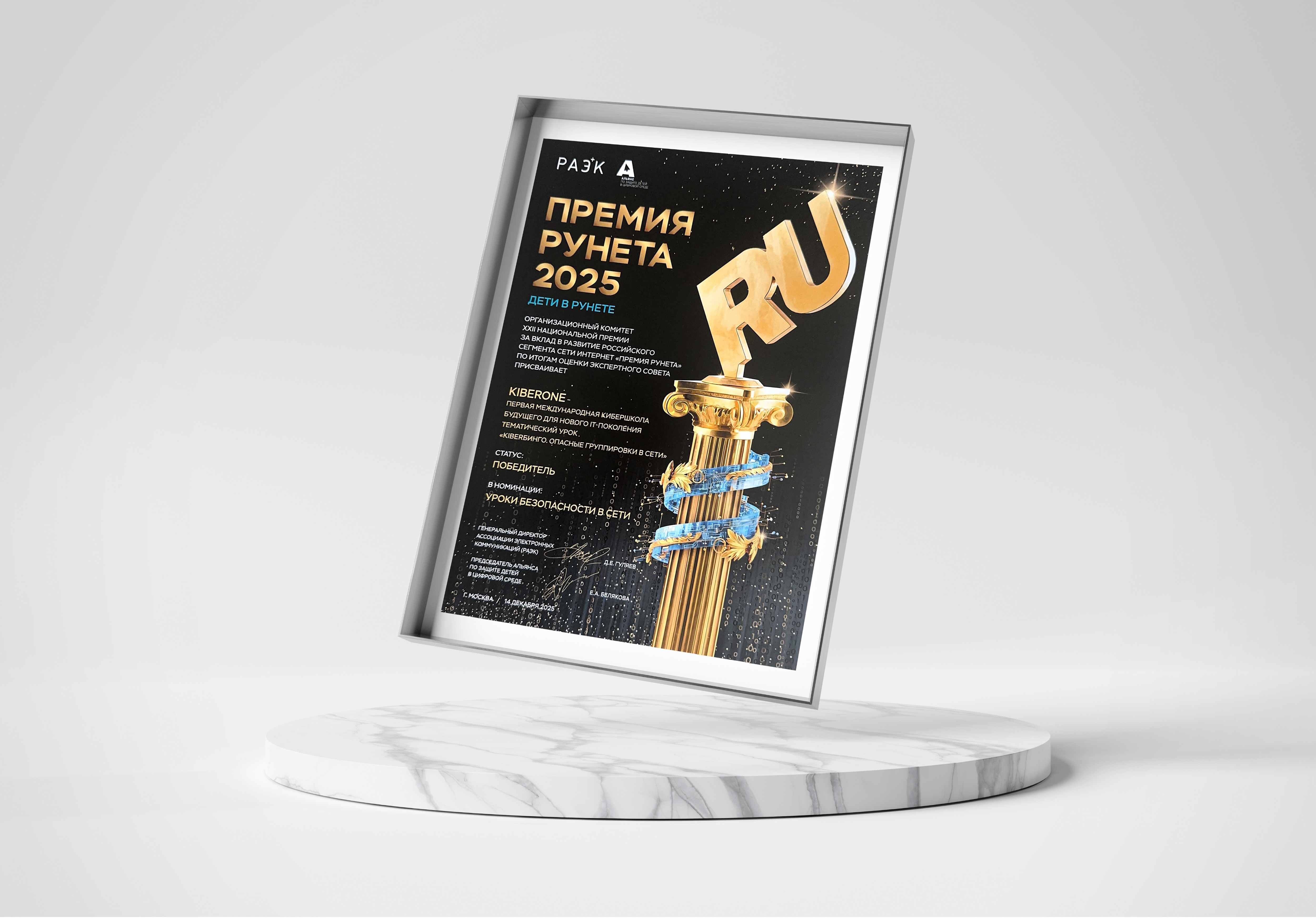Международная школа цифровых технологий для детей KIBERone стала победителем всероссийского конкурса «Премия Рунета 2025» в номинации «Уроки безопасности в сети», учрежденной Альянсом по защите детей в цифровой среде.